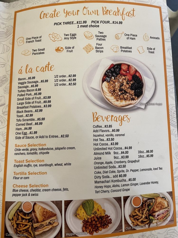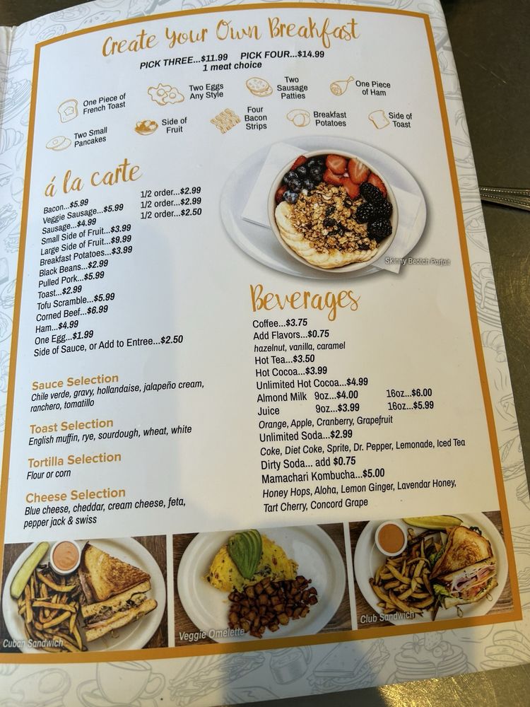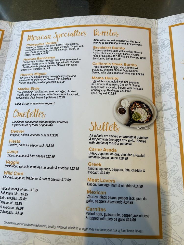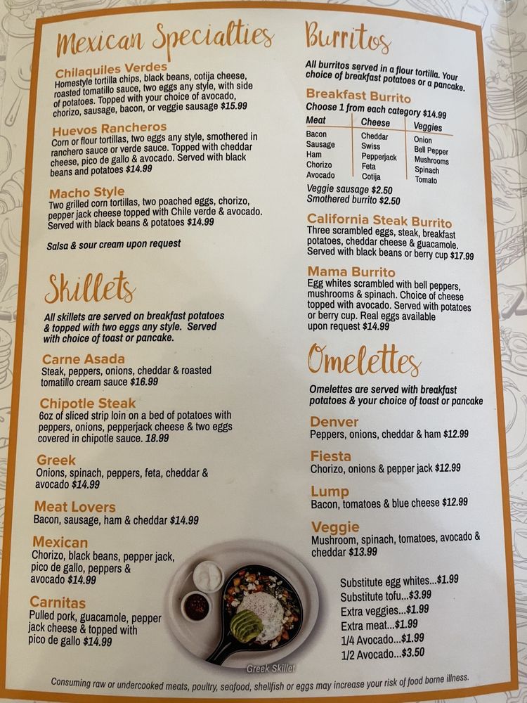 Sauteed peppers, avocado, onions, spinach, with melted cheddar and feta cheese, over skillet potatoes, 2 eggs cooked any style, choice of toast and tortillas.