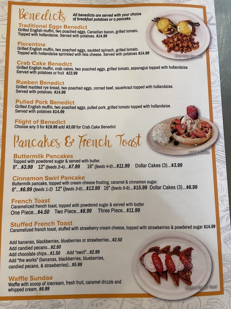 Traditional benedict with poached eggs, Canadian bacon, tomato and our house made hollandaise served on English muffin.